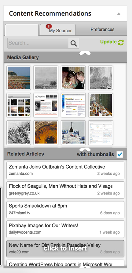 Zemanta used to be one of the most essential services for WordPress news sites. They offered not only a great selection of public domain images that could easily be inserted into a story, but that also offered links to similar stories.