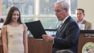 Evita Griskenas (2nd from right) with her father and brother at the Orland Park Village Board meeting Monday June 20, 2016